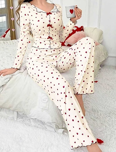 Per donna Set Pigiama Casual Comfort Cuore Maglietta Pantalone Casa Manica Lunga Girocollo Rosso Primavera Autunno Inverno