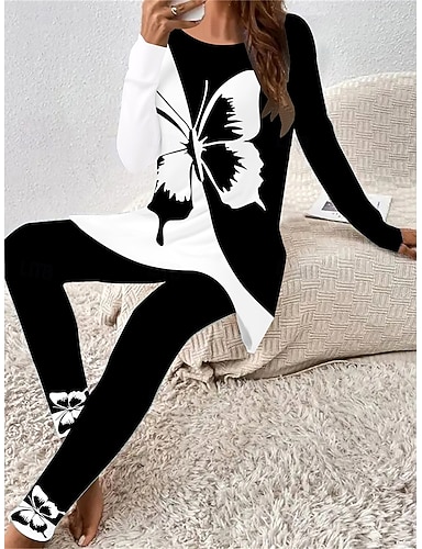 Per donna Elegante Vacanza Moda Maglietta Set di Pantaloni Manica Lunga Girocollo Grafico Farfalla Stampato Casuale Quotidiano Casual Quotidiano Bianco Blu Primavera Vestibilità regolare