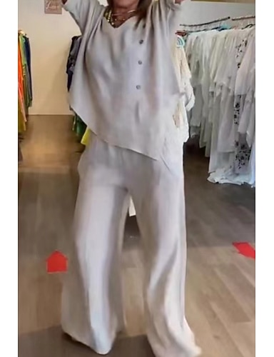 Per donna Camicia Set di biancheria in cotone Set da due pezzi Pantaloni di Lino Pantaloni Manica Lunga Scollo a V Tinta unica Moda Streetwear Ferie Abbigliamento quotidiano Nero Bianco Blu marino