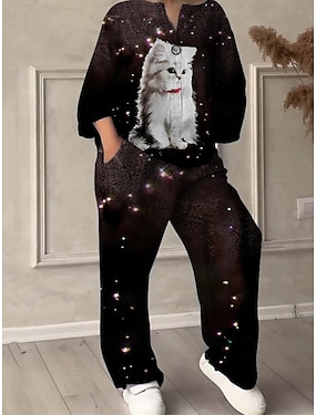 Per donna Attivo Moda Set di Pantaloni Manica Lunga Scollo a V Gatto Stampato Vacanza Quotidiano Ferie Nero Estate Vestibilità regolare