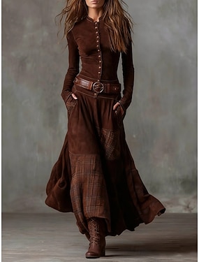 Per donna Abito Midi Abito Lungo Maxi Abito Abito Vintage Abito in finta pelle scamosciata Vintage Moda Quotidiano All'aperto Vacanza Vestibilità regolare Semplice Manica Lunga Girocollo Nero Marrone