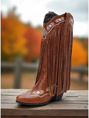 stivali da cowboy con frange western da donna: stivali alti fino al ginocchio in similpelle marrone con dettagli ricamati, stile country retrò per rodeo, festival autunnali e moda contadina