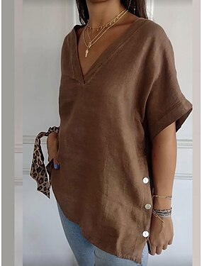 Per donna Blusa Finto cotone e lino Tinta unica Elegante Quotidiano Casual Manica Corta Scollo a V Top Regolari Quotidiano Nero Bianco Marrone Albicocca Estate Primavera