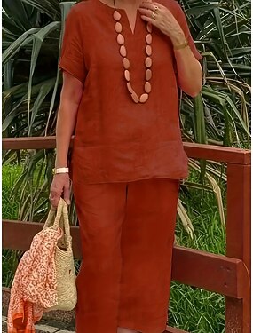 Completo pantaloni da donna in lino al 15%, completo in lino, tinta unita, tasca, elastico in vita, t-shirt, pantalone, casual, a maniche lunghe, girocollo, blu, nero, bianco, blu navy, marrone chiaro, estate, primavera