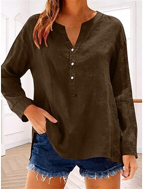 Per donna Camicia Blusa Finto cotone e lino Bottoni Semplice Casual Manica Lunga Scollo a V Top Regolari Quotidiano Ferie Uscire Nero Rosa Rosso Marrone Albicocca Estate Primavera