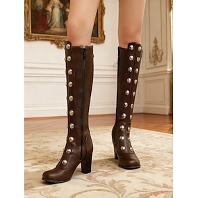 stivali alti fino al ginocchio in similpelle nera da donna con dettagli borchiati - calzature con tacco spesso di ispirazione medievale per l'autunno, l'inverno e le feste serali