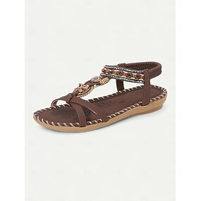 sandali marroni con decorazioni in stile boho da donna - calzature infradito piatte decorate con cristalli per festival estivi, gite in spiaggia e incontri informali