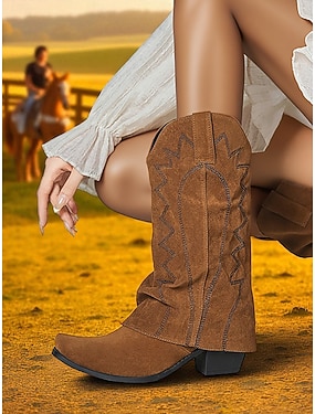 stivali da cowboy western in pelle scamosciata marrone da donna - comodi stivali da passeggio con tacco a blocco a punta e altezza metà polpaccio per donne, stile bohémien, ideali per festival