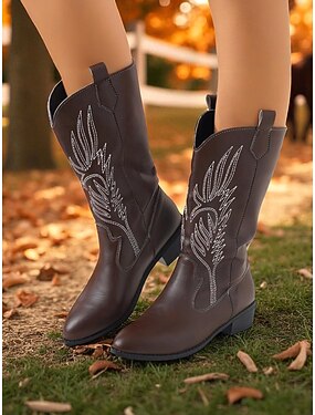 stivali da cowboy western da donna color moka con dettagli ricamati bianchi e tacchi a blocco, calzature in stile western bohémien