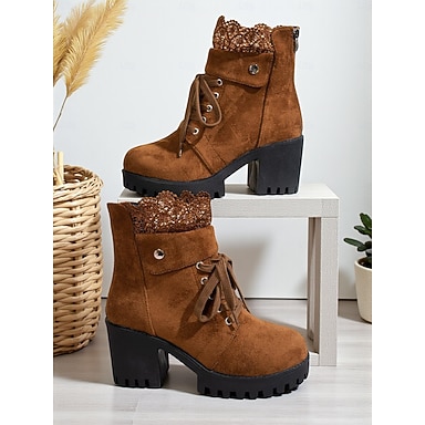 stivaletti allacciati marroni da donna con tacco spesso e rifiniture all'uncinetto, stivaletti vintage in finta pelle scamosciata per outfit casual ed eventi all'aperto