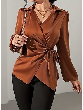 Per donna Camicia Blusa Nodo frontale Tinta unica Vintage Elegante Moderno Manica Lunga Scollo a V Top Regolari Quotidiano Lavoro Uscire Marrone Estate Primavera