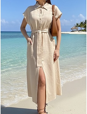 Per donna Abito Midi Finto cotone e lino Abito a trapezio Casual Quotidiano Vestibilità regolare Semplice Manica Corta Bavero Beige Estate Primavera