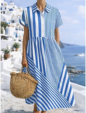 abito midi da donna in finto cotone e lino, abito boho, abito a camicia in misto lino, prendisole elegante, bohémien, etnico, spiaggia, vacanza, righe geometriche, maniche corte, colletto a camicia,