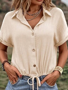 Camicia in lino sintetico da donna camicia casual camicia con bottoni arricciata coulisse bottoni colore solido semplice quotidiana elegante casual a maniche corte maniche a pipistrello scollo