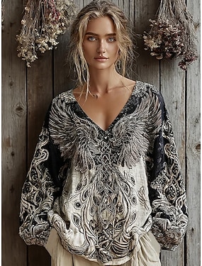 Camicia boho in lino sintetico da donna grafica floreale elegante bohemia vintage a maniche lunghe scollo a V top regolari quotidiano vacanza stampa blu bianco viola arancione estate primavera