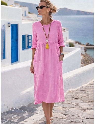 Per donna Abito Midi Abito a trapezio Abito Estivo Casual Quotidiano Vestibilità comoda Semplice Manica 3/4 Girocollo Blu Giallo Rosa Fucsia Estate Primavera