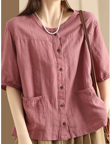 Per donna Blusa Finto cotone e lino Tasca Bottoni Semplice Elegante Casual Mezza Manica Girocollo Top Regolari Quotidiano Nero Bianco Rosa Verde Cachi Estate Primavera