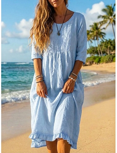 Per donna Abito Midi Finto cotone e lino Abito da Spiaggia Vestito Casual Vestito Estivo Vacanza Essenziale Ferie Weekend Vestibilità comoda Semplice Manica 3/4 Girocollo Blu Nero Verde Albicocca
