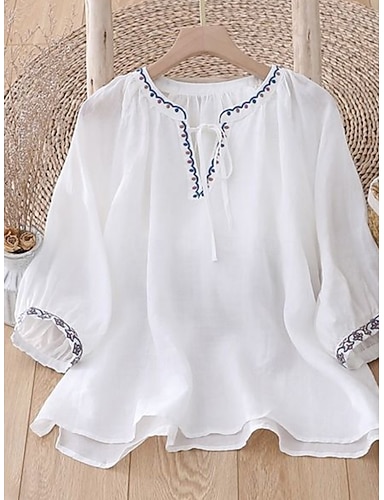 Per donna Blusa Finto cotone e lino Ricamato Floreale Elegante Casual Manica 3/4 Scollo a V Top Regolari Quotidiano Bianco Rosa Verde Estate Primavera