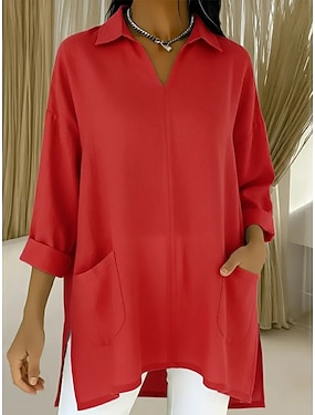 Blusa in lino donna in misto cotone tasche bottoni tinta unita stilosa casual maniche lunghe colletto top lunghi quotidiani blu nero bianco rosso viola primavera autunno