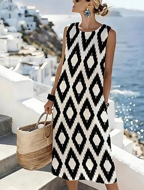 Per donna Abito Midi Abito a Tubino Vestito Estivo Abito a trapezio Vacanza Casual Boho Spiaggia Uscire Vestibilità regolare Grafico Geometrico Senza Maniche Girocollo Nero Estate Primavera