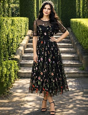 Abito A-Line Floreale Giorno di San Valentino Ospite di Matrimonio Lunghezza Té Mezza Manica Collo Illusion in Pizzo con Applicazioni Ricamate