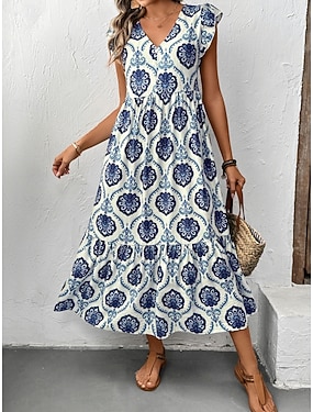 Per donna Abito Midi Abito a trapezio Vacanza Casual All'aperto Uscire Vestibilità comoda Floreale Senza Maniche Scollo a V Blu Verde Estate Primavera