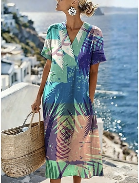 Per donna Abito Midi Vestito Estivo Vestito Casual Vacanza Casual Spiaggia Spiaggia Feste Vestibilità comoda Grafico Foglia Geometrico Manica Corta Scollo a V Blu Verde Estate Primavera