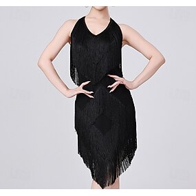Abito da ballo latino con frange e nappe con ruches, solido allenamento da donna, senza maniche, alto poliestere/abito da festa da ballo