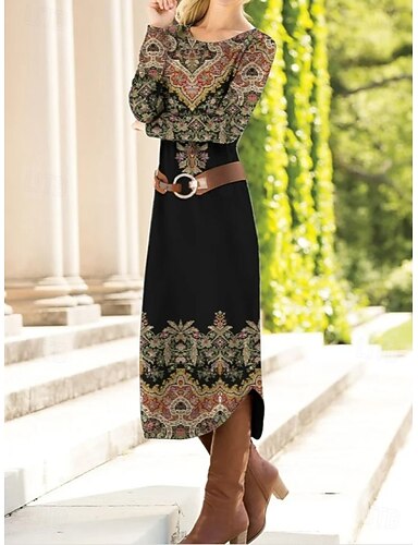 Per donna Abito Midi Abito a Tubino Tubino Casual Quotidiano Vestibilità regolare Floreale Grafico Paisley Manica Lunga Girocollo Nero Primavera Autunno Inverno