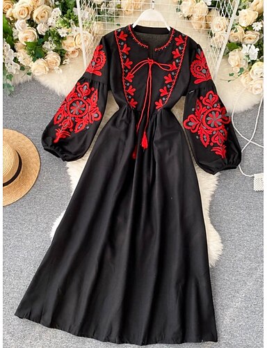 Per donna Abito maxi Abito a trapezio Vacanza Casual Boho All'aperto Uscire Vestibilità comoda Floreale Paisley Etnico Manica Lunga Scollo a V Nero Estate Primavera Autunno