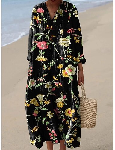 Per donna Abito maxi Vestito Estivo Abito a trapezio Vacanza Casual Boho Spiaggia Feste Vestibilità comoda Floreale Grafico Manica Lunga Scollo a V Marrone scuro Nero Beige Estate Primavera