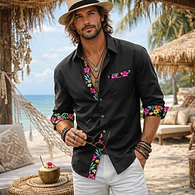 camicia da uomo, camicia di lino, camicia estiva, abbigliamento da spiaggia, camicia con bottoni, floreale, casual, quotidiano, boho, nero, bianco, rosa, grigio, manica lunga, risvolto, estate,