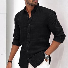 100% lino Tasche Per uomo Camicia camicia di lino Camicia con bottoni Nero Blu marino Manica lunga Liscio Bavero Primavera & Autunno Esterno Da mare Abbigliamento