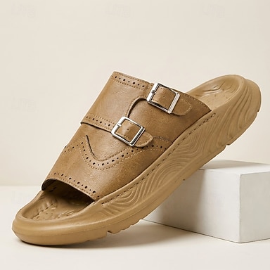sandali da uomo in similpelle marrone con cinturino largo, plantare morbido, design facile da infilare per adulti, ideali per il relax in casa, per il comfort estivo in salotto