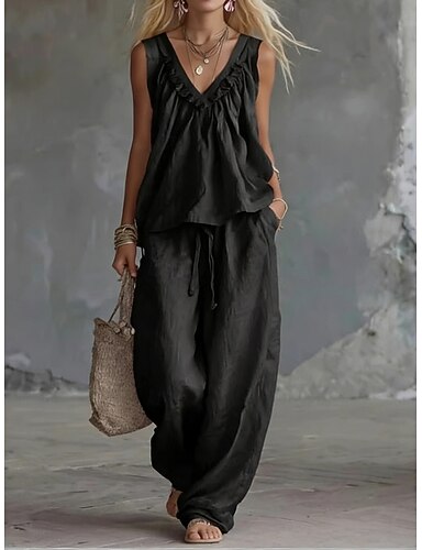 Per donna Set di Pantaloni Finto cotone e lino Senza Maniche Girocollo Tinta unica Moda Streetwear Casuale Quotidiano All'aperto Blu Nero Bianco Estate Vestibilità regolare