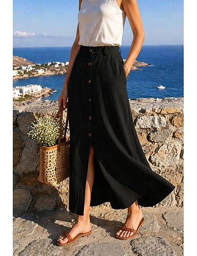 Per donna Gonna da vacanza Gonna in finto cotone e lino Moda stile della nonna costiera Casual Estate Maxi Misura del girovita medio Gonne Tinta unita Inelastico Quotidiano Vacanza Nero Bianco Blu