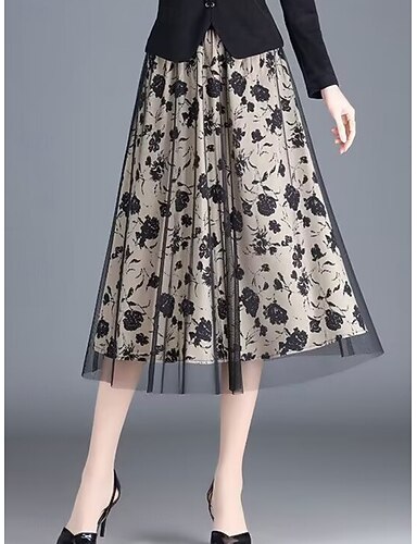 Per donna Elegante Casual Midi Misura del girovita medio Gonne Floreale Pizzo Volant Orlo irregolare Micro-elastico Data Casual Quotidiano Nero Estate Chiffon