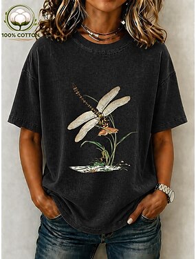 Per donna 100% cotone Maglietta Top lavati effetto vintage Stampato Grafico Libellula Elegante Essenziale Manica Corta Girocollo Top lunghi Casuale Quotidiano Blu Nero Rosa Viola Marrone Estate