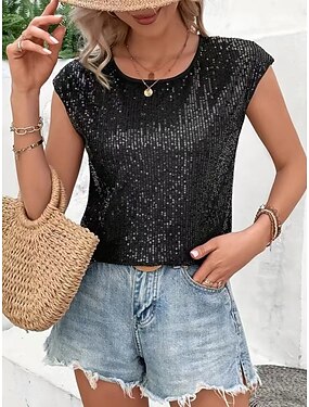 Per donna Maglietta Paillettes Tinta unica Grafico Semplice Moda Classico Casual Senza Maniche Manica Corta Girocollo Top Regolari Quotidiano Uscire Weekend Articoli color oro Nero Bianco Vino Rosso