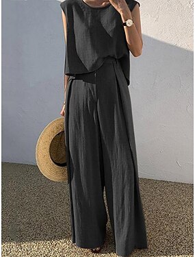 Per donna Set da due pezzi Gilet Finto cotone e lino Pantaloni a Gamba Larga Senza Maniche Girocollo Semplice Moda Streetwear Quotidiano Casuale Quotidiano Nero Blu marino Cachi Estate Vestibilit