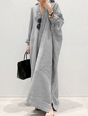 Per donna Abito maxi 100% cotone Abito a Tubino Abito Camicia Vestito a caftano Essenziale Casual Quotidiano All'aperto Vacanza Vestibilità comoda A righe Manica Lunga Colletto a Camicia Blu Nero
