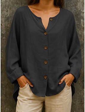 Camicie di cotone e lino Camicia di lino Abbottonare Top Lungo in Cotone Per donna Nero Bianco Cachi Tinta unica Lungo Quotidiano Streetwear Moda Girocollo Lino Vestibilità regolare S