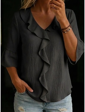 Per donna Blusa Finto cotone e lino Volant Tinta unica Elegante Casual Manica 3/4 Scollo a V Top Regolari Quotidiano Nero Bianco Rosa Rosso Verde Primavera Autunno