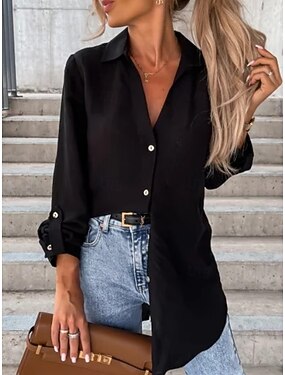 Per donna Camicia Camicie ispirate al lino Abbottonare Blusa Tasca Bottoni Tinta unica Elegante Casual Manica Lunga Colletto a Camicia Top Regolari Quotidiano Nero Bianco Marrone Cachi Estate