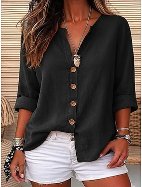 Camicie da donna 100% cotone, camicetta con bottoni, tinta unita, basic, casual, manica a 3/4, scollo a V, top regolari, per tutti i giorni, nero, bianco, rosso, kaki, estate