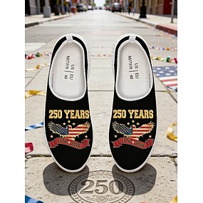 Sneakers slip-on blu patriottiche da donna: scarpe da passeggio leggere e traspiranti con bandiera americana e grafica per il 250° anniversario, ideali per il tempo libero, eventi festivi, viaggi e