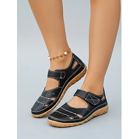Scarpe Mary Jane nere da donna con intagli, comode scarpe basse con suola antiscivolo, cinturino regolabile con velcro, calzature casual per giardino e spiaggia &attività estive
