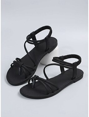 sandali bassi intrecciati neri da donna con design a cinturini, suola comoda e stile casual per l'uso estivo e le uscite in spiaggia