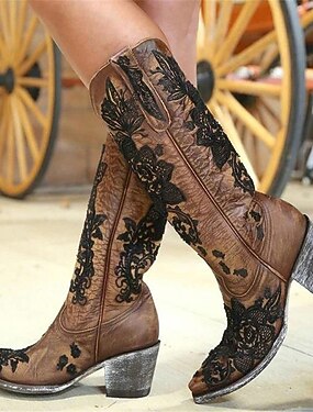 stivali da cowboy western marroni da donna con intricati ricami in pizzo floreale nero - ideali per matrimoni in campagna, eventi rustici e feste a tema western